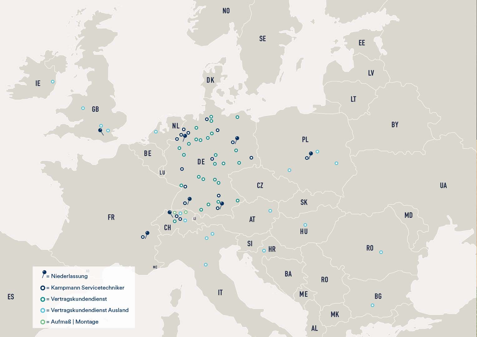 Mit 50 Standorten in Deutschland und 30 internationalen Servicepoints ist die Kampmann Service GmbH immer dort, wo unsere Kunden uns brauchen.